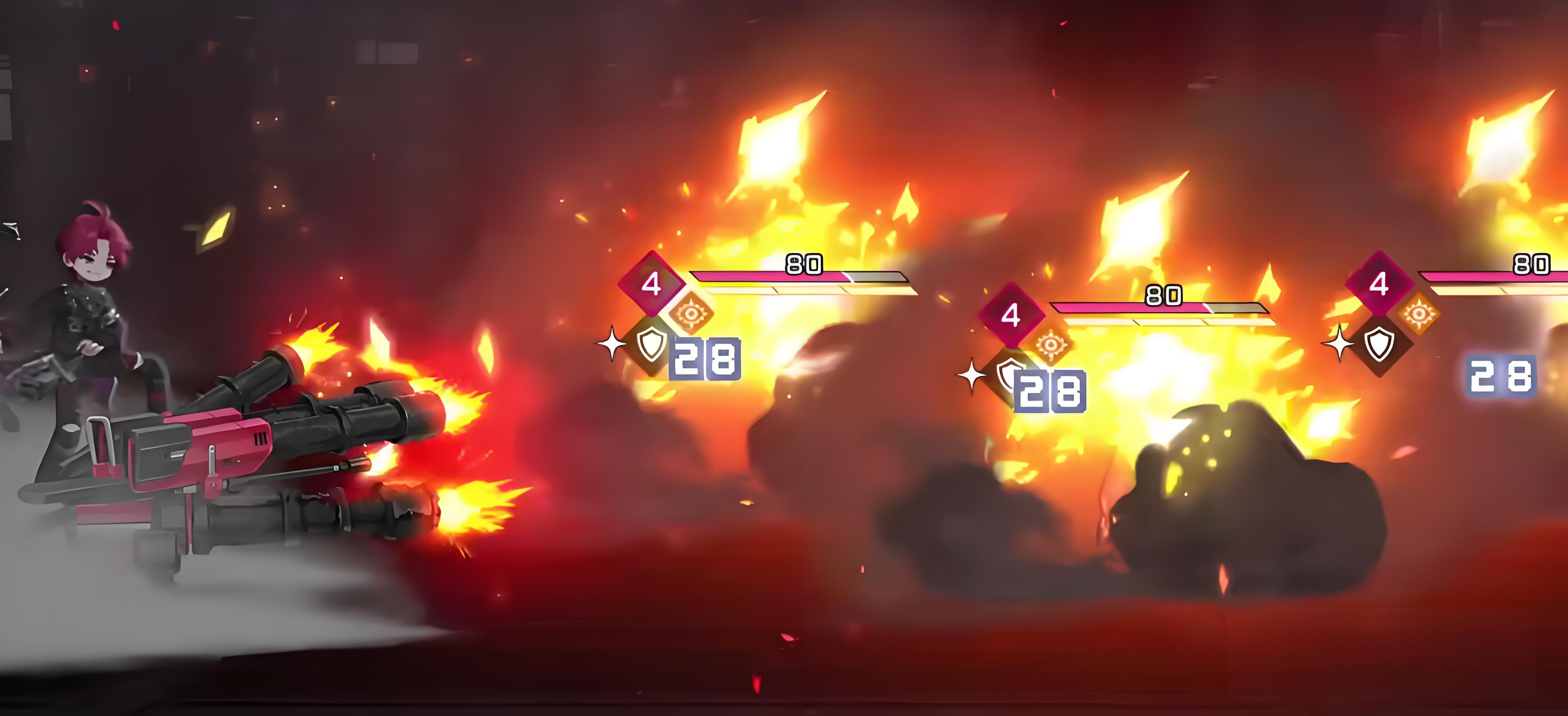 2、關鍵技能各有側重,火焰斬擊可對全體敵人造成范圍傷害,全彈發射能觸發大范圍爆炸實現清屏壓制。