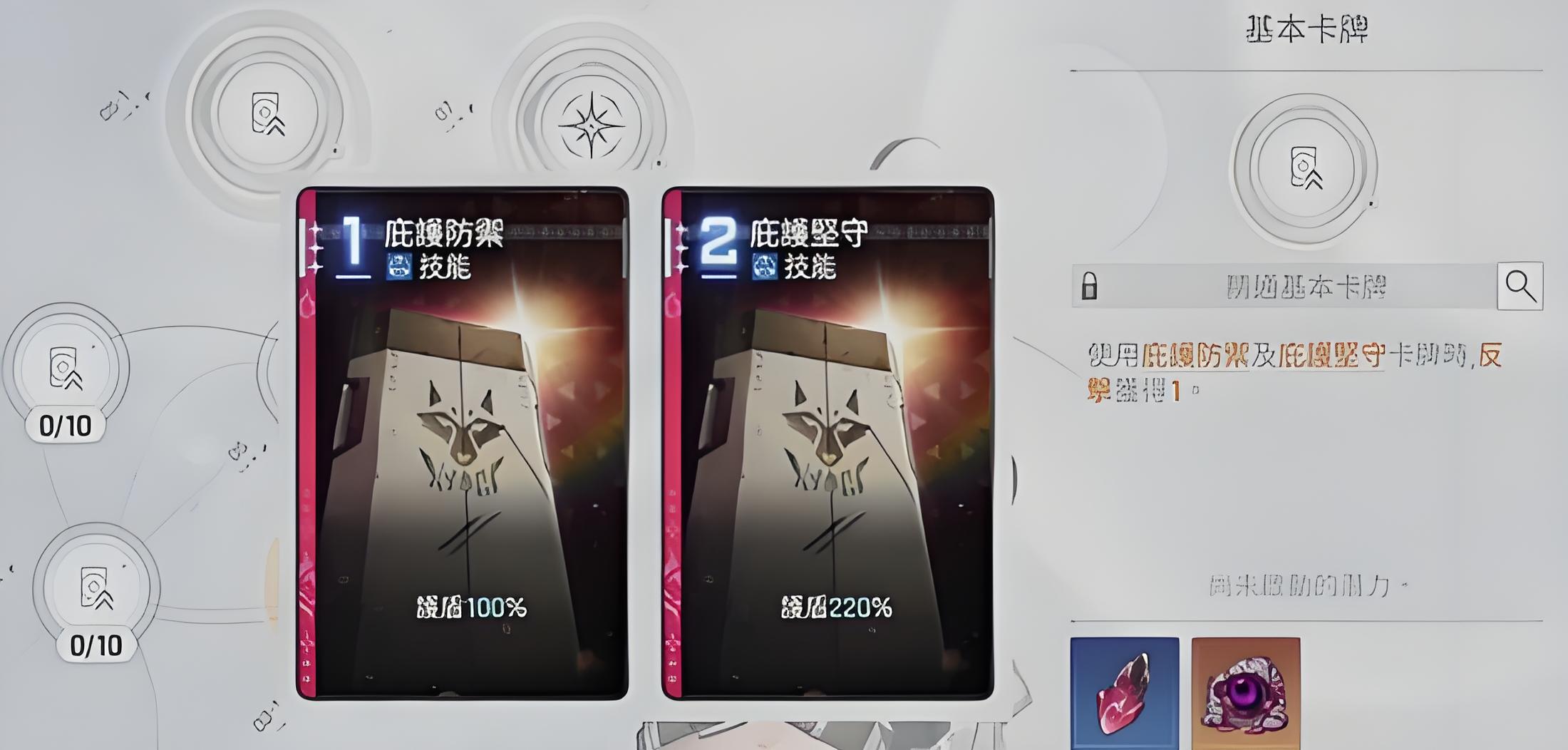 3、初始卡組包含四張基礎卡牌,庇護防御低費速生護盾,庇護堅守高費高護盾量,攻擊卡牌傷害與防御值相關聯。