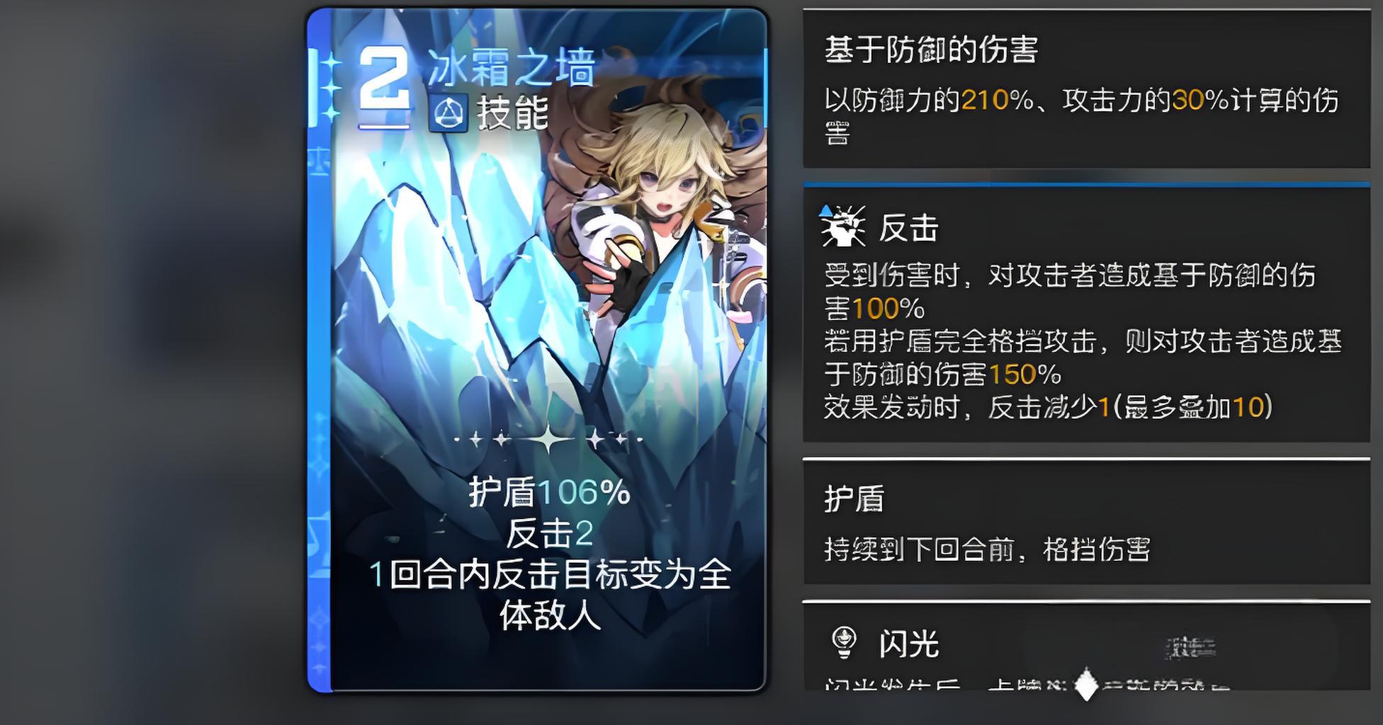 5、冰壁可強化反擊效果,使1回合內反擊目標變為全體敵人,同時提升大招傷害,大招傷害隨反擊次數增加,實戰中能穩定打出高額數值。
