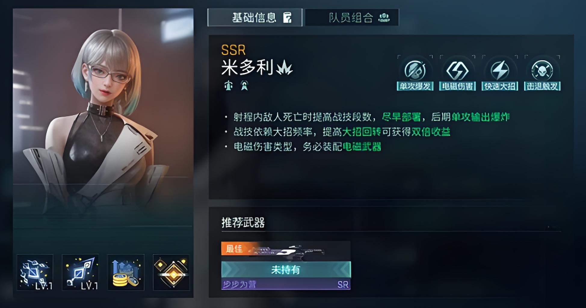 3、米多利側重電磁傷害輸出上限高,射程影響傷害系數戰技段位提升戰力,需疊加層數強化攻擊,搭配充能輔助才能保障大招高頻釋放。