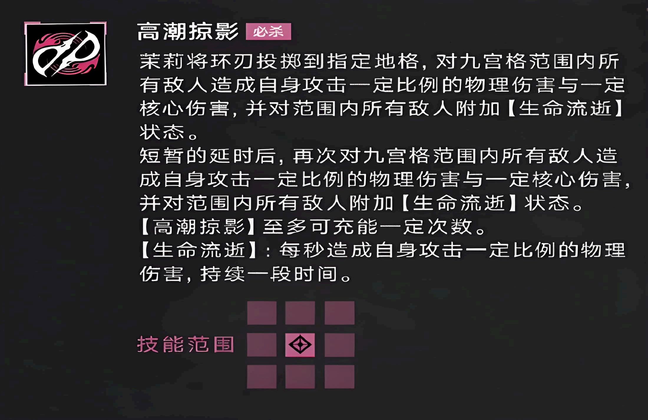 3、必殺技針對指定九宮格區域,兩次觸發傷害并疊加持續掉血狀態,支持多次充能使用,為團隊持續輸出提供核心保障。