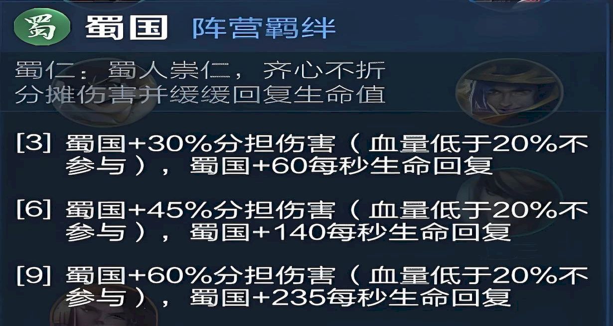 2、蜀國陣營強化生存能力,提供傷害分擔比例,搭配每秒生命回復,血量較低的單位不參與傷害分擔。