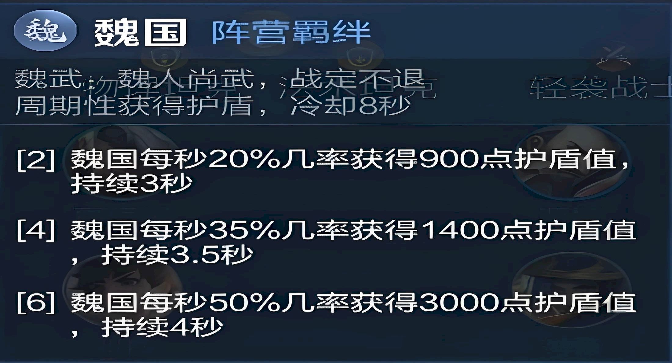 3、魏國陣營主打護盾防護,讓英雄有幾率獲得護盾,等級越高觸發概率和護盾效果越佳,存在固定冷卻時間。