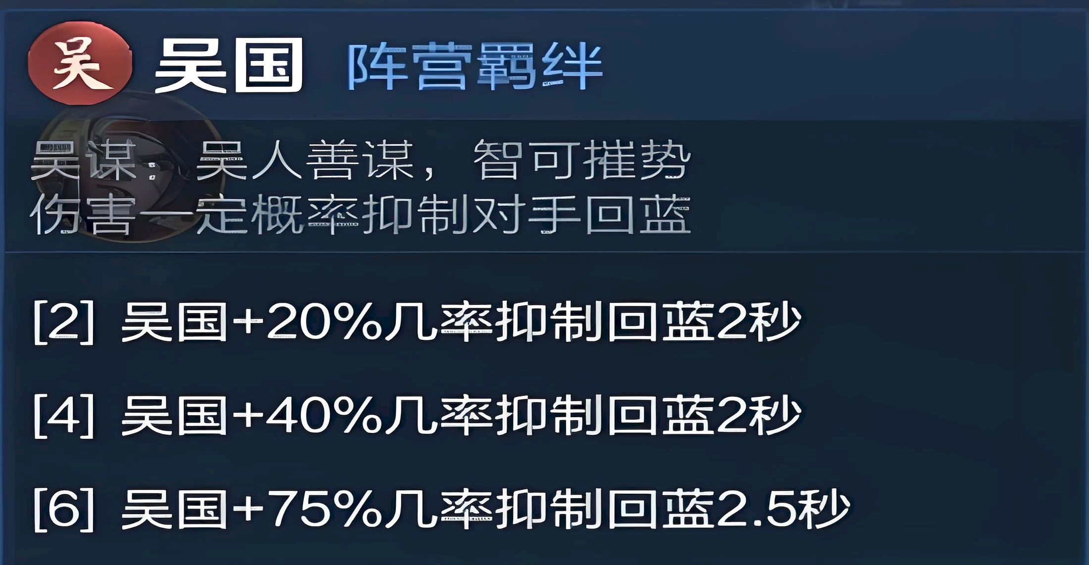 4、吳國陣營聚焦戰術壓制,使英雄造成傷害時有機率抑制對手回藍,等級越高觸發概率和持續時間越優,克制依賴技能輸出的陣容。