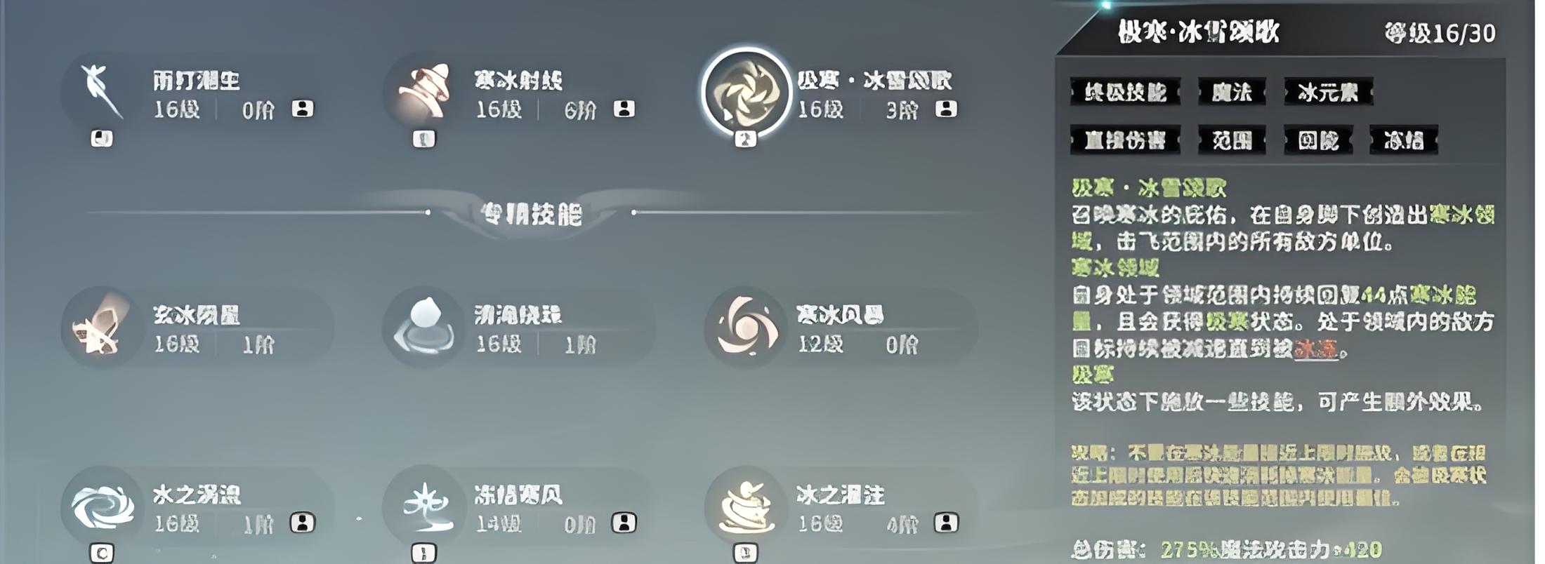 1、核心技能寒冰射線滿級后傷害充足且具備穿透性,可貫穿同一直線多個目標,刷圖時能高效清理密集小怪,搭配控制技能可應對移動目標保障輸出連貫。