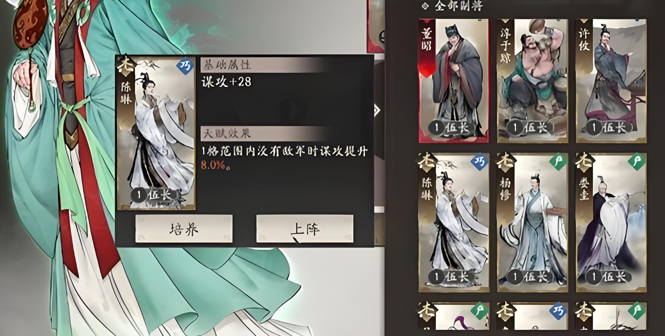 三國望神州中的陳琳是河北陣營杰級副將,雖無法擔任主將但在特定陣容中作用關鍵。她以謀略屬性加成為核心價值,適合需要提升謀略輸出的隊伍,尤其適合游戲前期資源有限的情況。搭配時需注意站位與主將類型,與部分副將還能形成經典組合,下面將詳細解析她的屬性效果與使用要點。