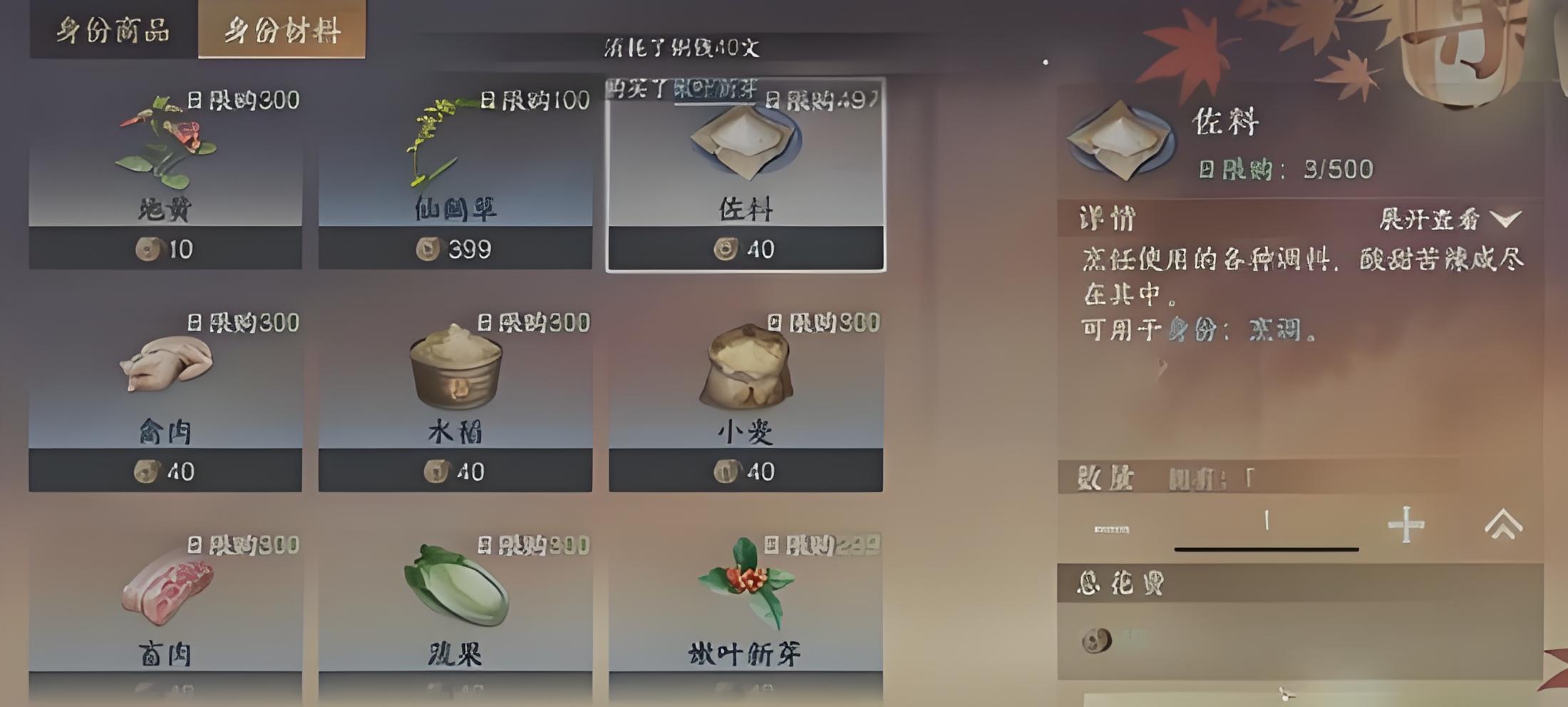 2、籌備必備食材,核心食材為一份小麥,調味料需三份作料,食材需通過對應渠道收集,確保數量達標再啟動烹飪。