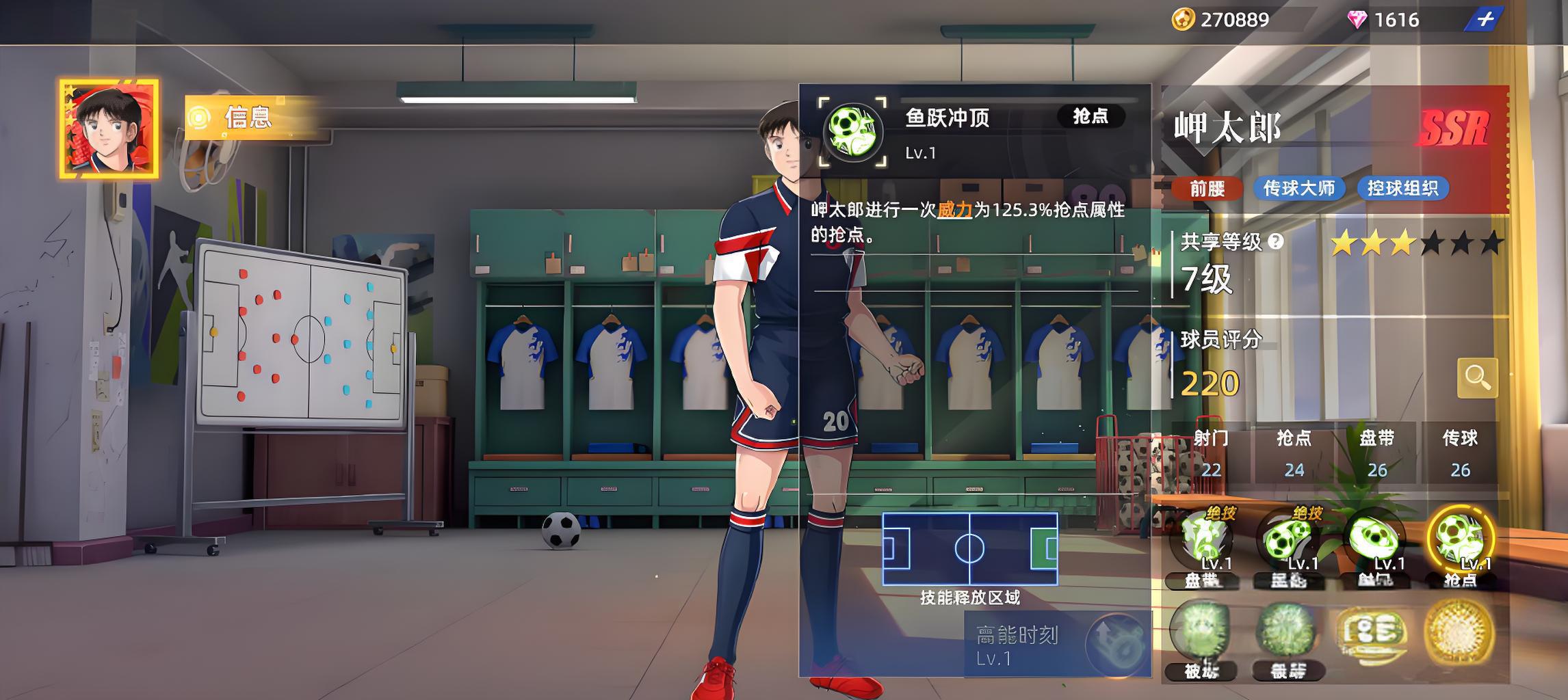 3、被動技能強化實力,輕盈律動提升盤帶與接球加成,默契傳達提高短傳成功率并恢復控制值,魚躍沖頂可爭奪高空球權。