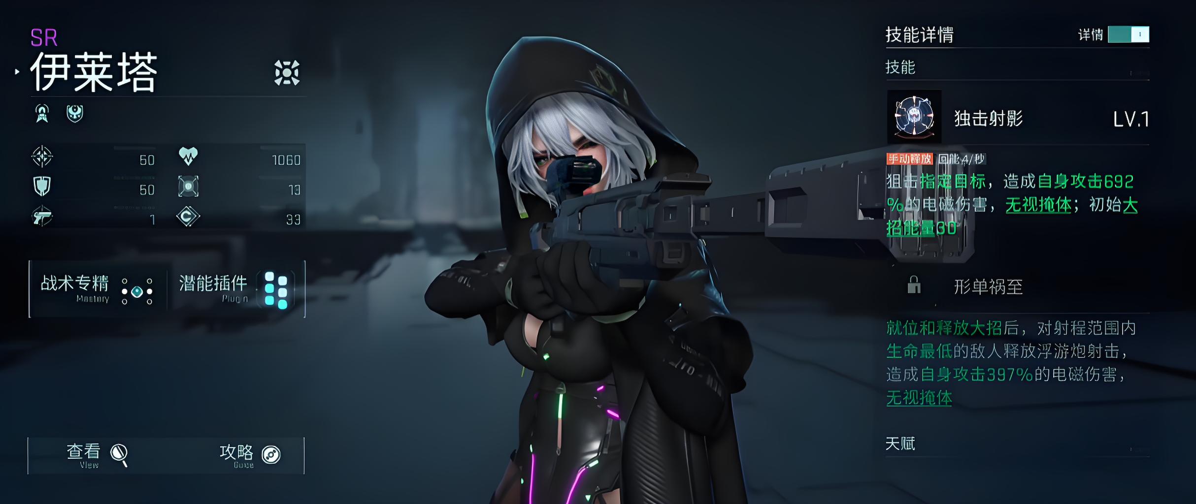 1、伊萊塔擁有突擊射影技能,手動釋放可狙擊指定目標,造成自身攻擊692%電磁傷害,無視掩體初始需30點大招能量,每秒回能4點。