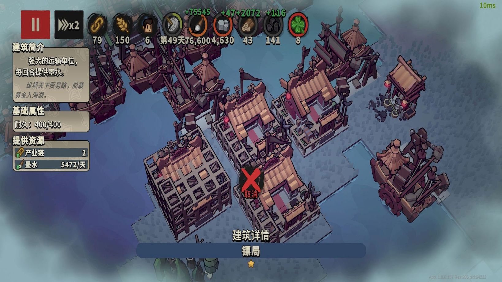 5、水域修貿易碼頭鏢局增墨水,曲折水域建維修碼頭產木材,保護農田避免赤字,資源溢出可巧設策略提升得分。