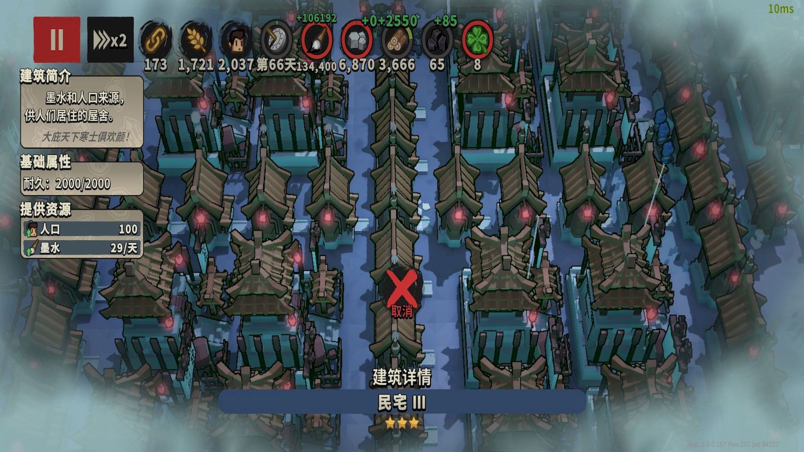 4、優先選擇有水地圖,必刷墨水轉石材buff,開局建農田民宅錢莊,伐木場少量建造,后期木材依賴維修碼頭。