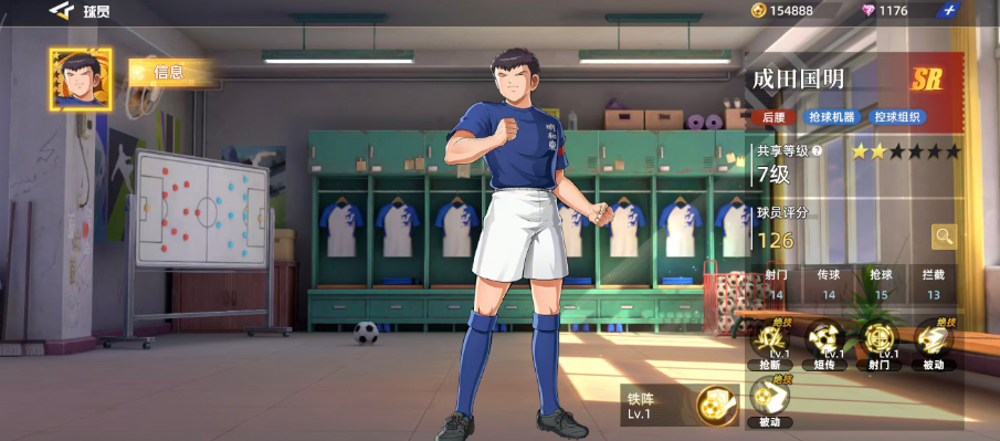 1、成田國明屬于SR品質,司職后腰,核心定位搶球機器與控球組織,屬性均衡搶球能力最優,射門傳球表現不俗。