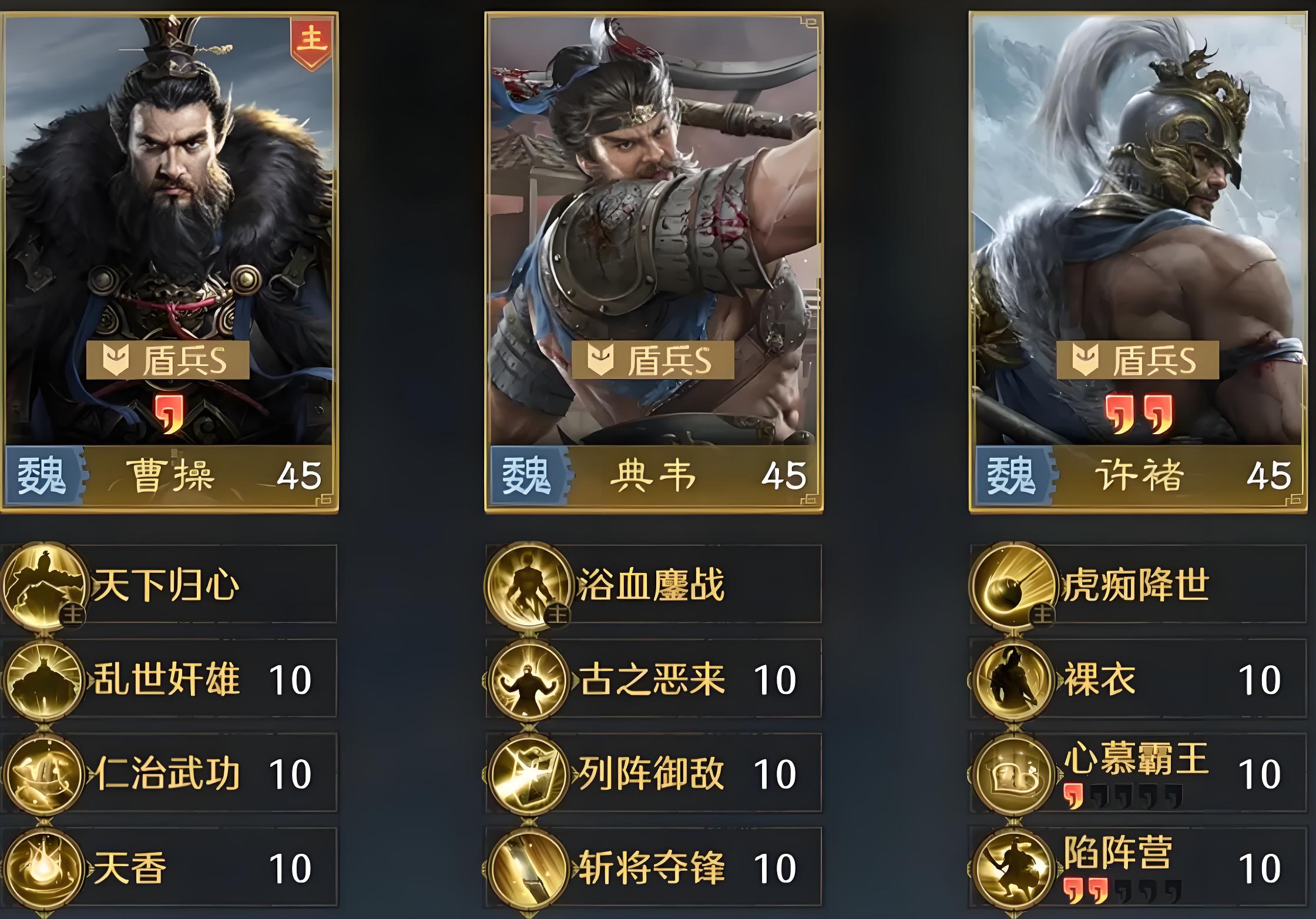 1、核心武將為曹操典韋許褚,三者兵種適性均達盾兵S級,典韋許褚前排負責輸出反擊,曹操專注治療減傷增傷,分工明確形成戰力閉環。