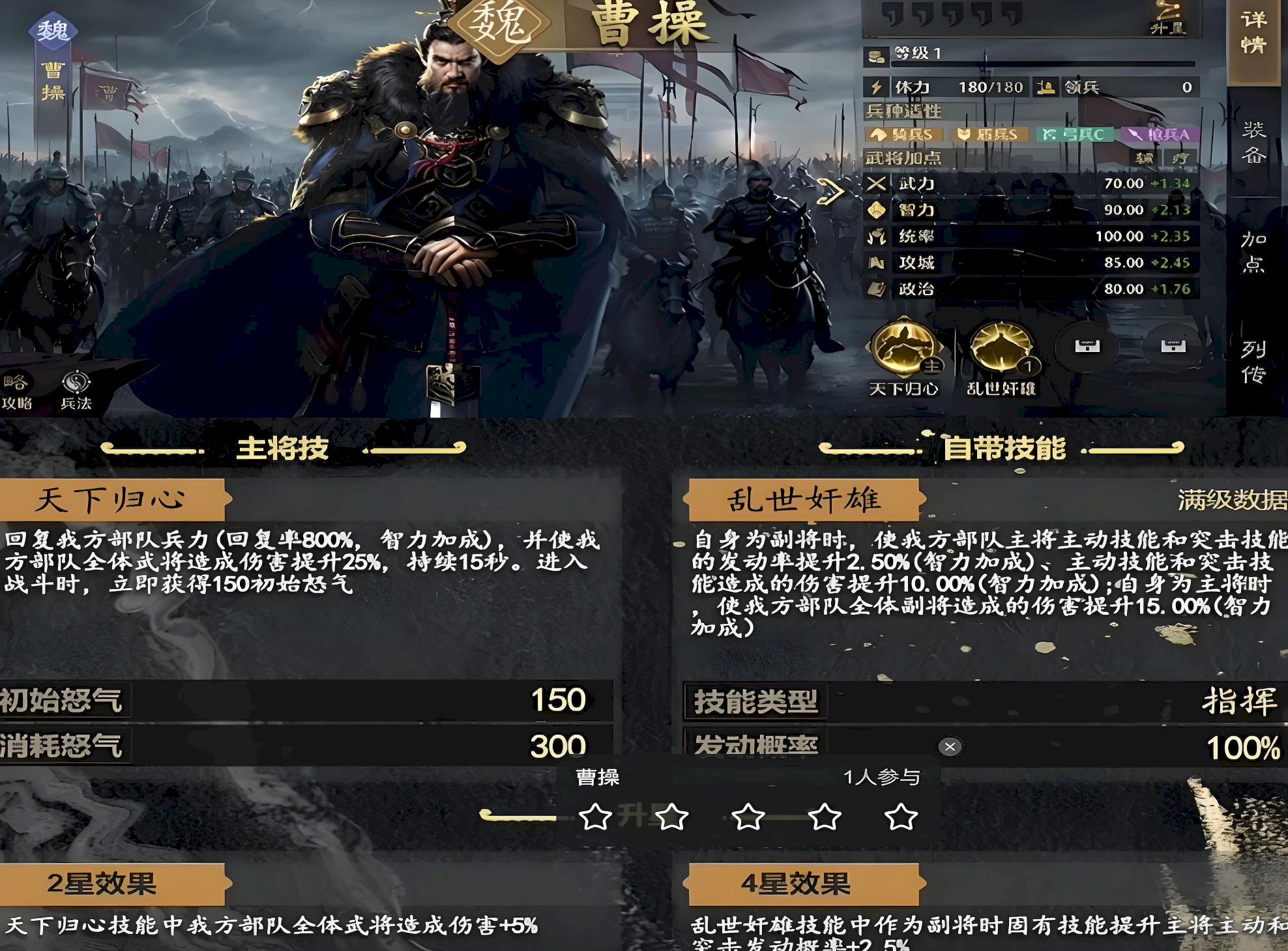 2、曹操可搭配仁治武功刮骨療毒等技能強化治療,輔以天香堅陣合一提升減傷增傷,自帶天下歸心技能回復兵力并增加全體傷害。