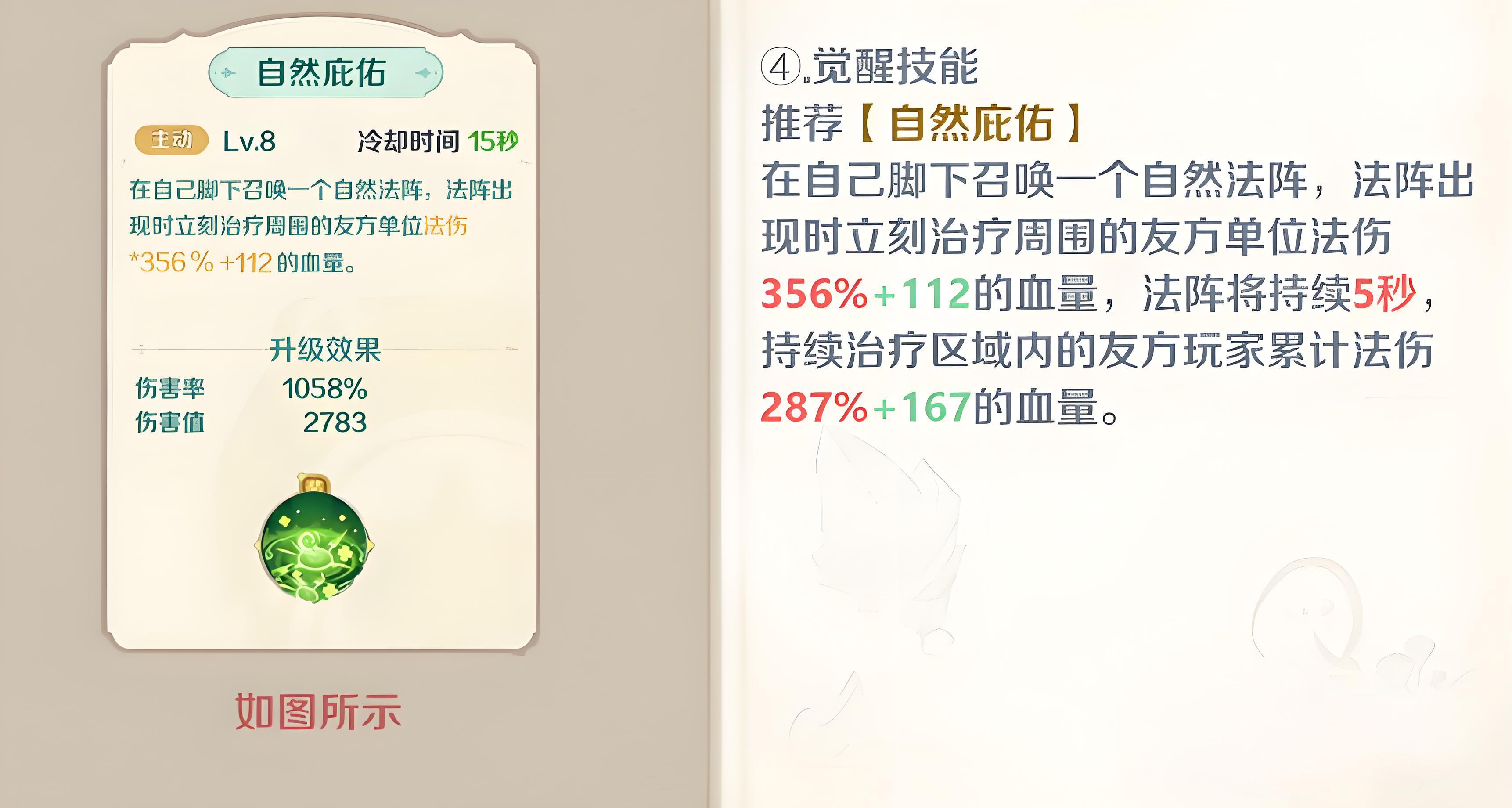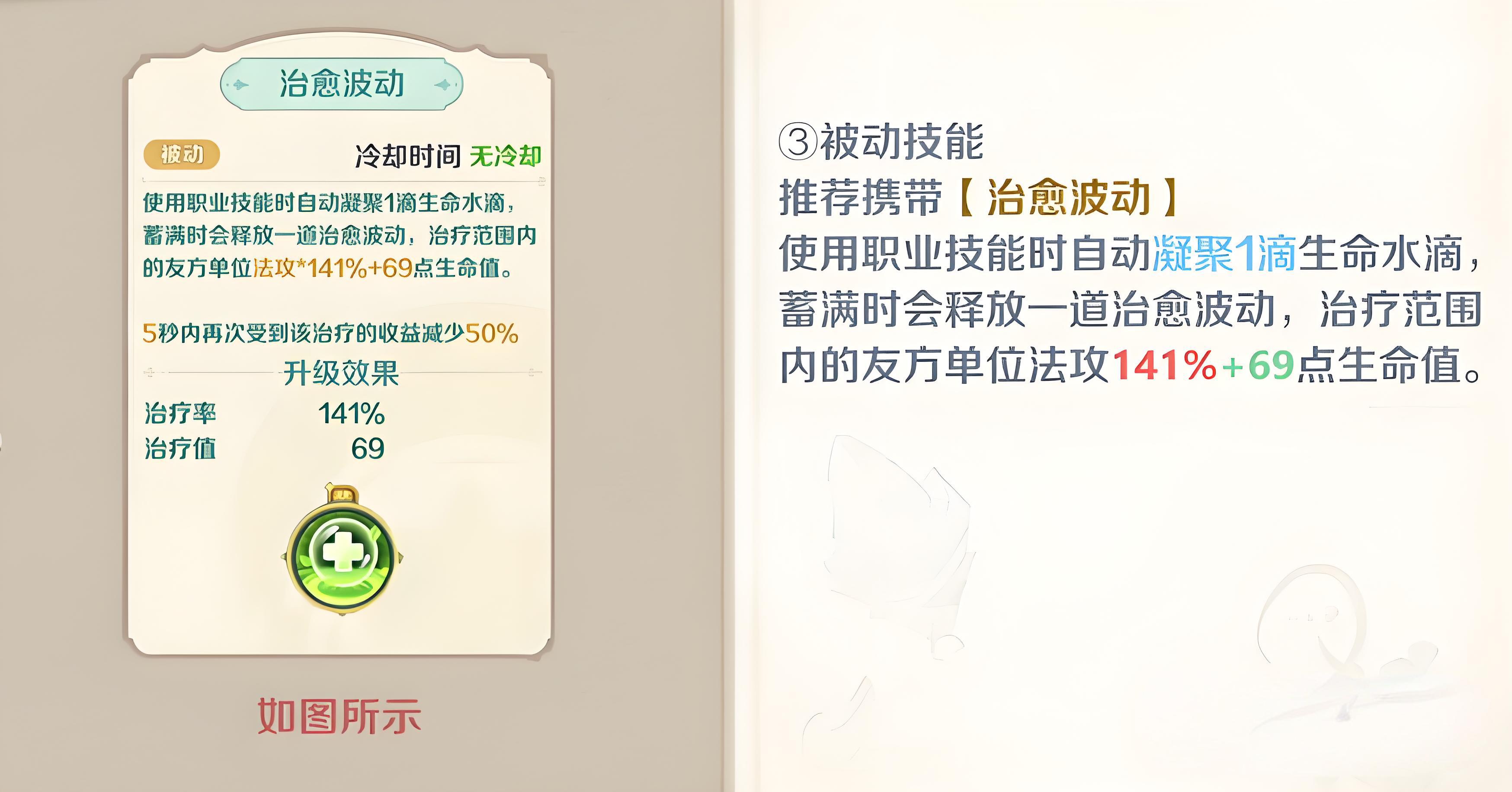 3、被動技能各有妙用,治愈波動蓄滿釋放治療波動,生命水滴針對單體急救,自然庇佑召喚法陣持續回血,均是團隊續航的重要保障。