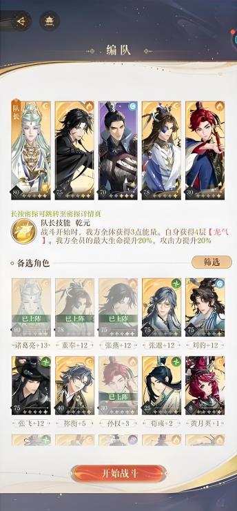 1、上陣密探選擇諸葛亮董奉張燕張退劉豹,隊長技能乾元提供能量龍氣及屬性加成,備選密探包含張飛禰衡等適配不同戰斗場景。