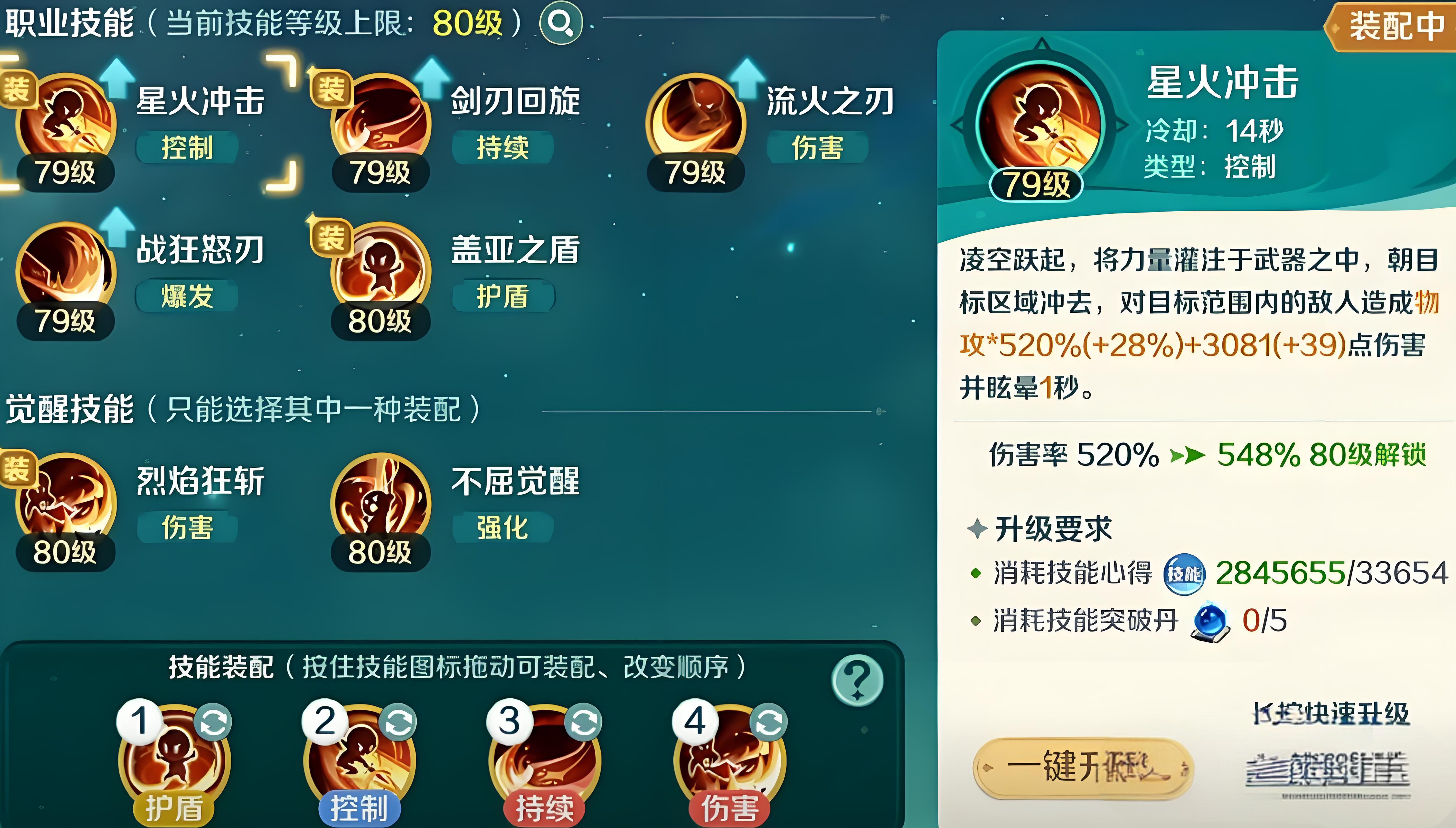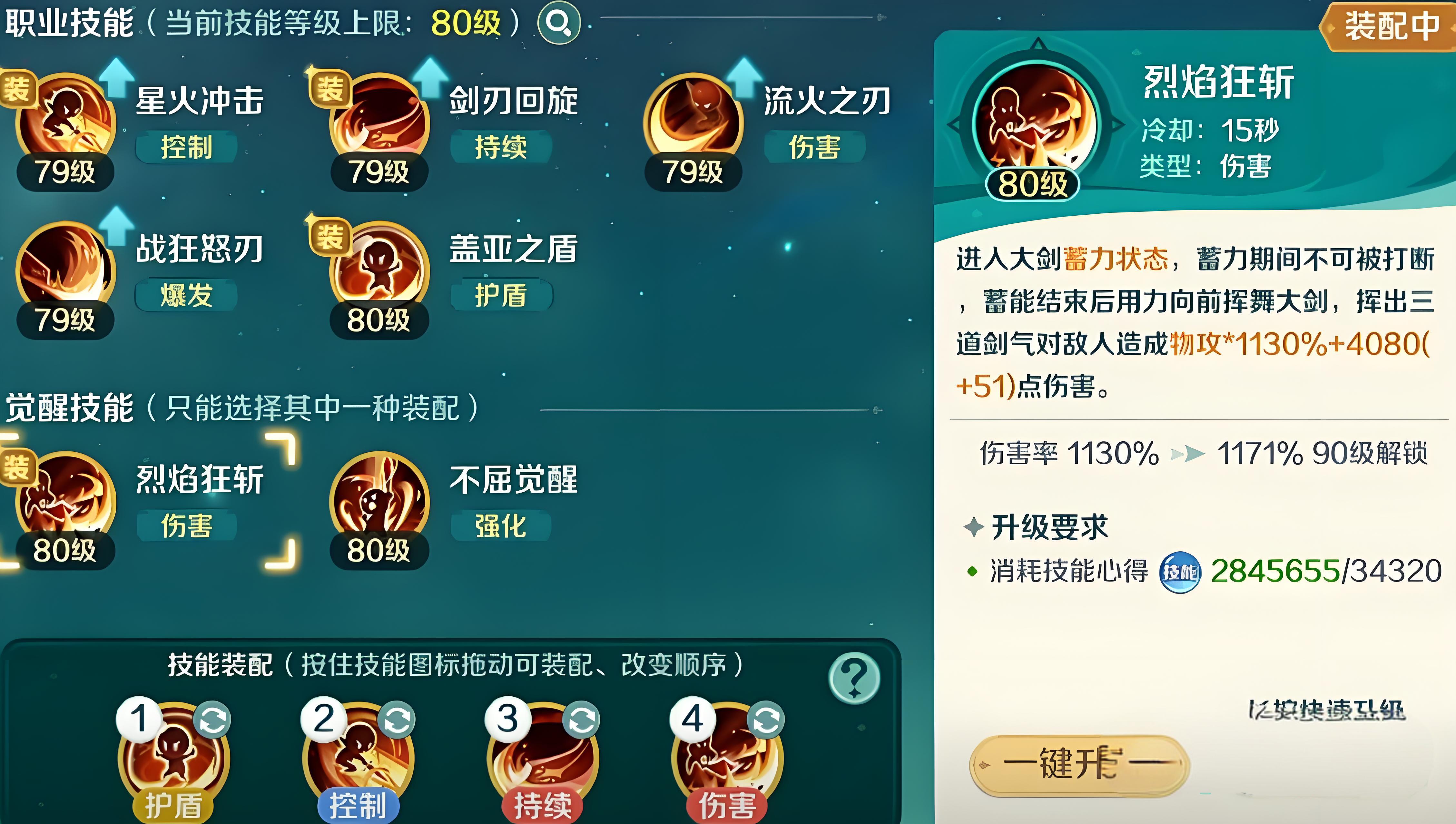 2、PVE側重輸出循環構建,核心技能流火之刃提供增傷加成,搭配范圍爆發與持續輸出技能,無需生存類技能即可保持高效清場能力。