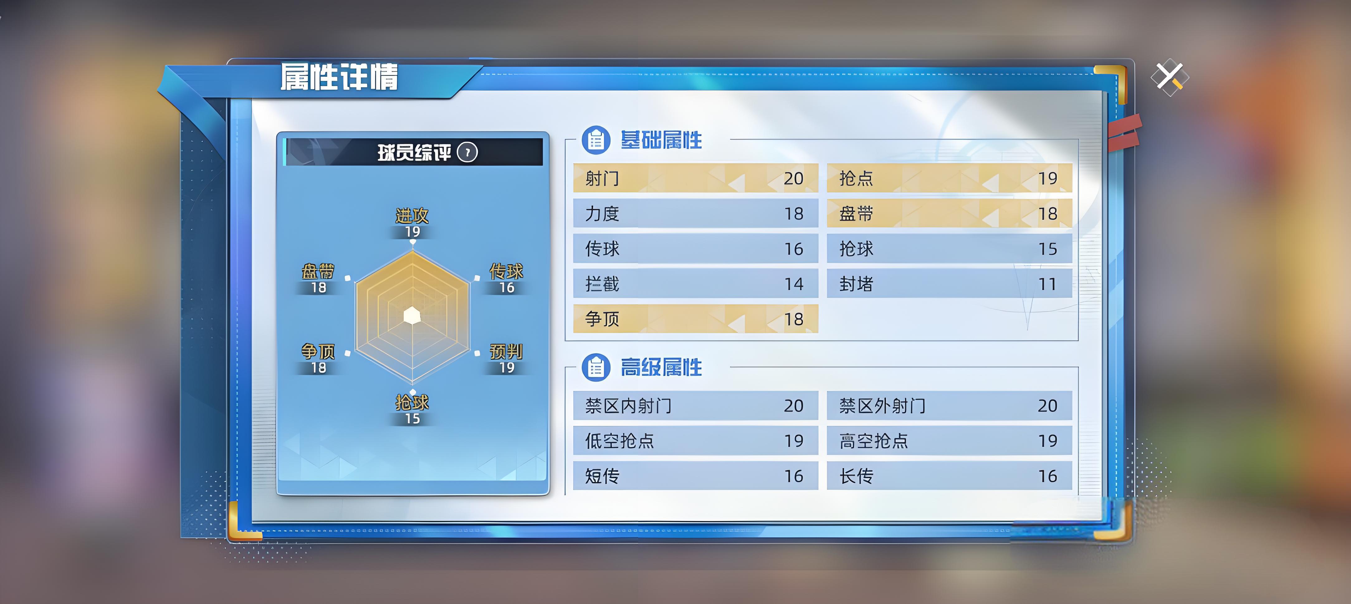 2、基礎屬性均衡評分164分射門20搶點19,盤帶爭頂均為18搶球15是短板,防守相關屬性普遍偏低。