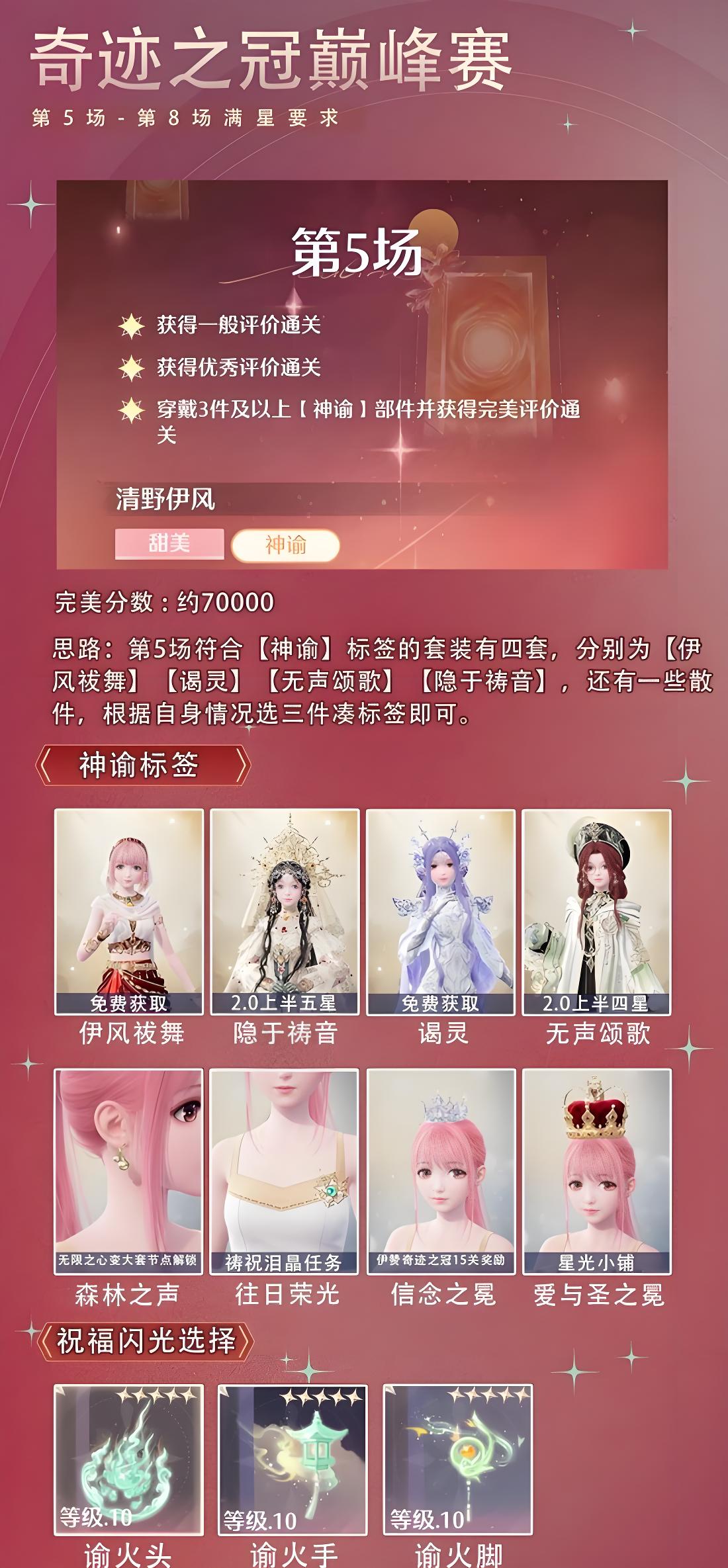1、第五場需獲取一般優秀完美三類評價,要穿戴三件及以上神諭部件并拿到七萬左右完美分數,可選用伊風祓舞等四套神諭標簽套裝或相關散件。