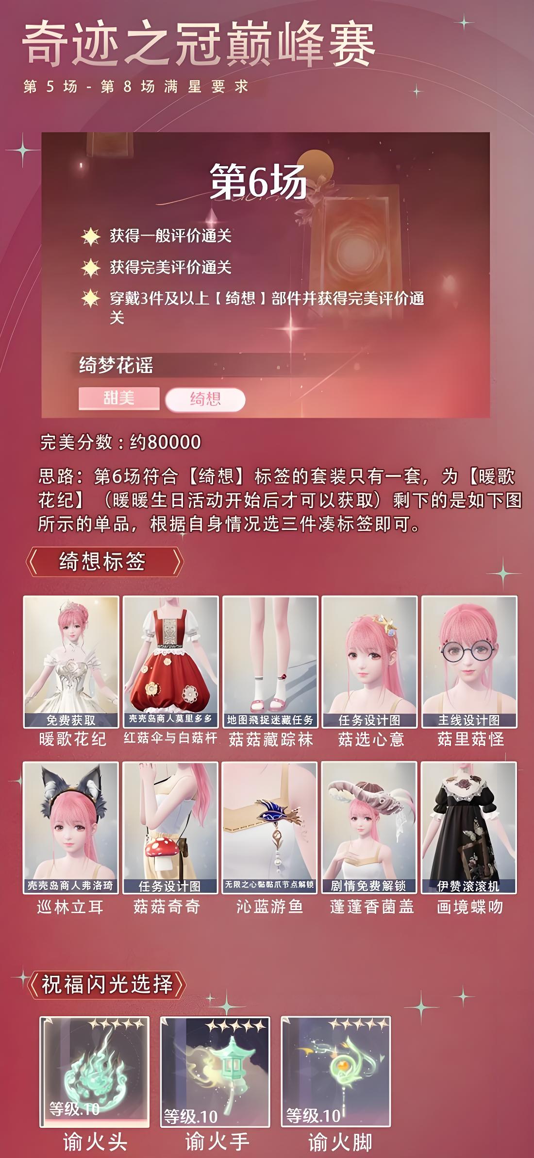 2、第六場要達成一般完美兩類評價,需穿戴三件及以上綺想部件且拿到八萬左右完美分數,無對應套裝可選用紅菇傘等綺想散件搭配。