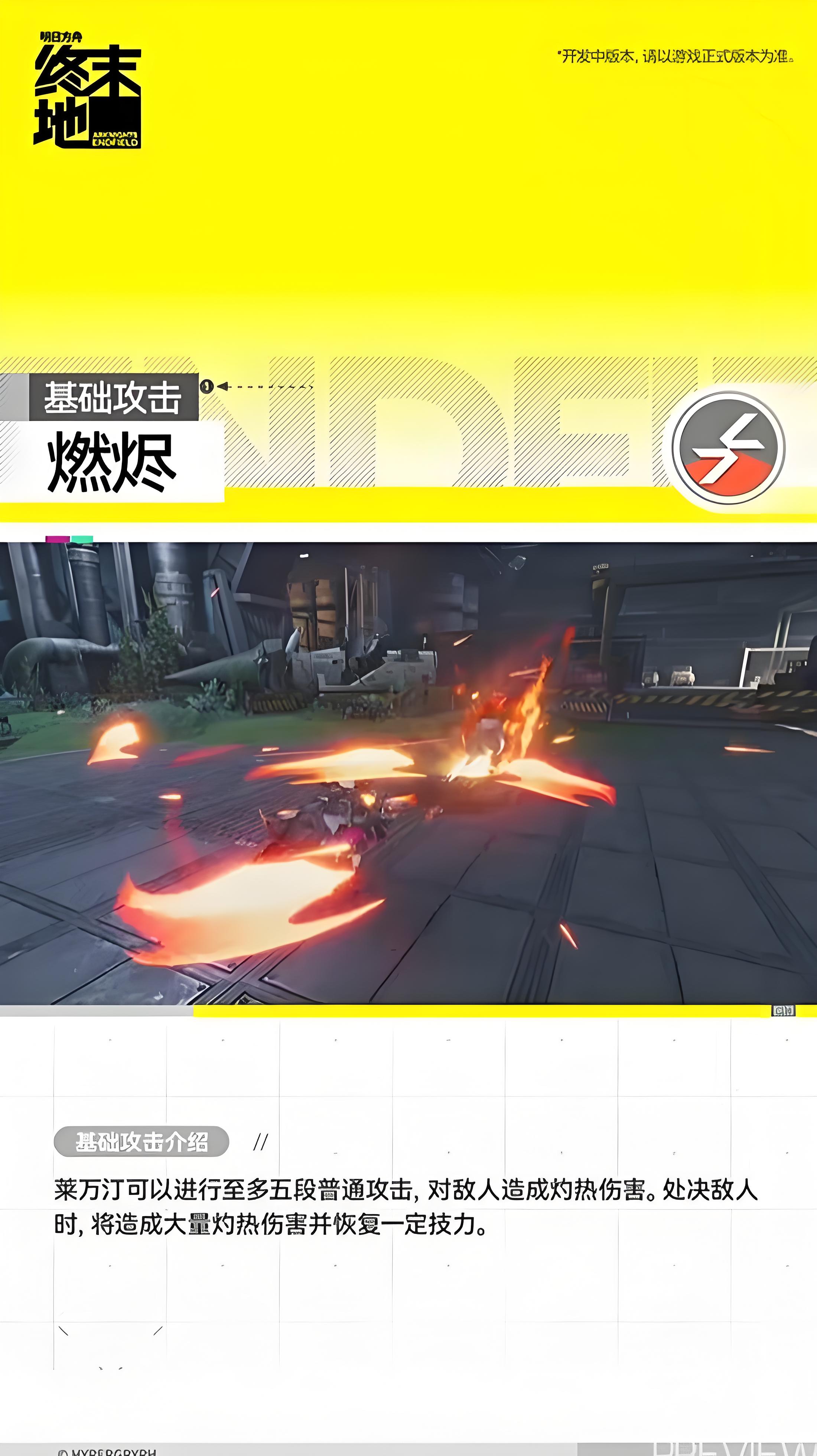 2、基礎攻擊為燃燼,可釋放至多五段普通攻擊,能對敵方造成灼熱傷害,處決敵方時會造成大量灼熱傷害且恢復自身一定技力。