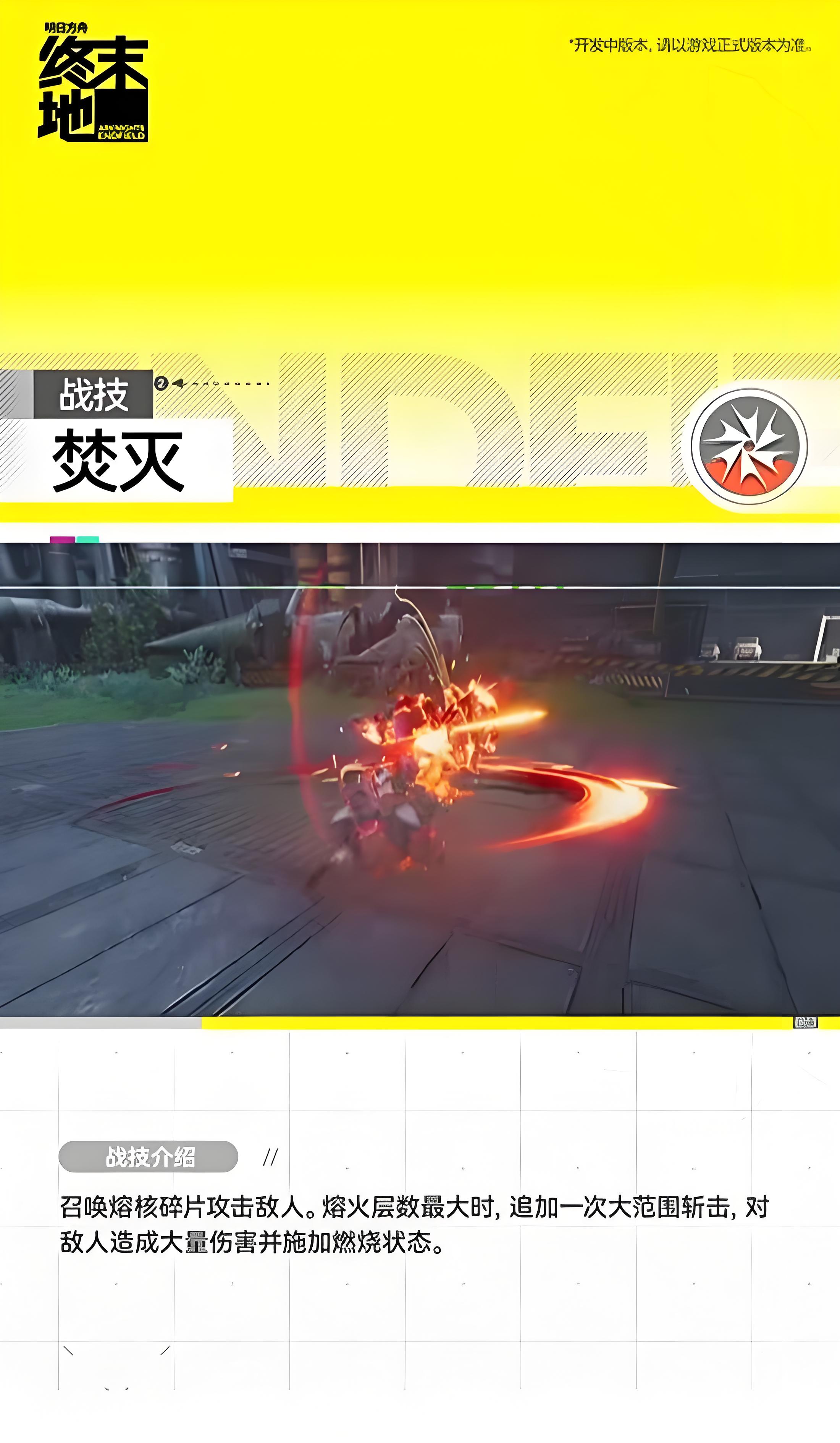 3、戰技為焚滅,可召喚熔核碎片攻擊敵方,熔火層數達最大時會追加一次大范圍斬擊,造成大量傷害且給敵方施加燃燒狀態。