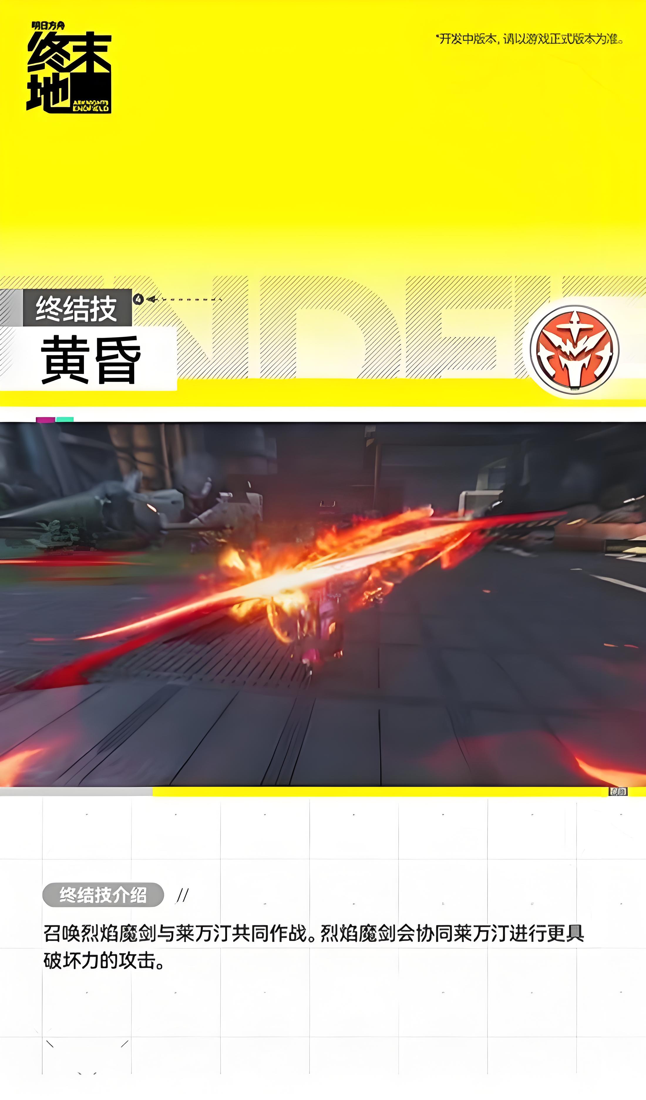 4、終結技為黃昏,能召喚烈焰魔劍和自身協同作戰,魔劍會配合本體發起更具破壞力的攻擊,顯著提高整體輸出能力。