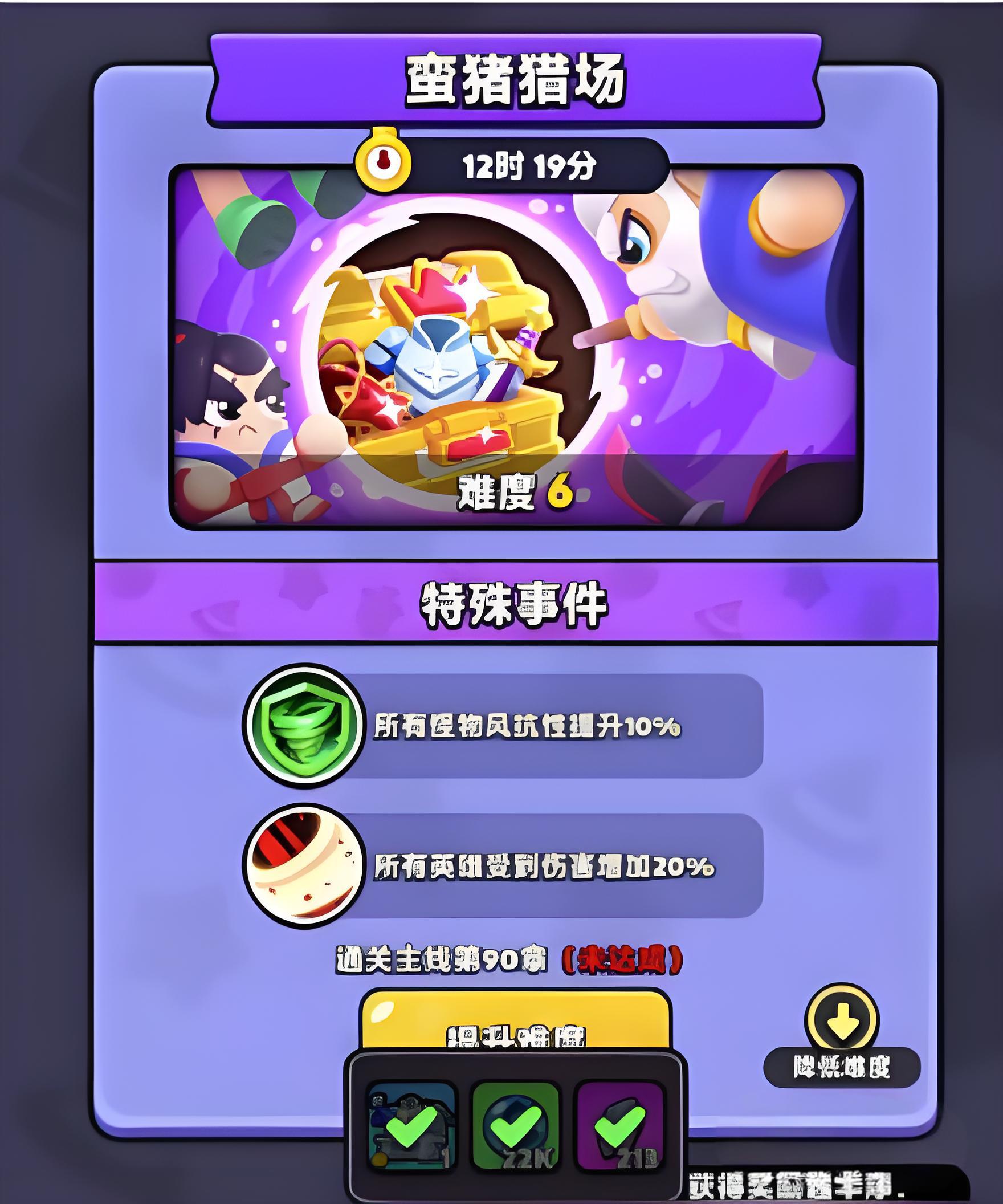 3、蠻豬豬場是獲取高品質裝備的關鍵,可沿用主線成型陣容,需關注通關評分,若高難度難達400分可降低難度保障獎勵獲取。