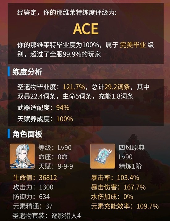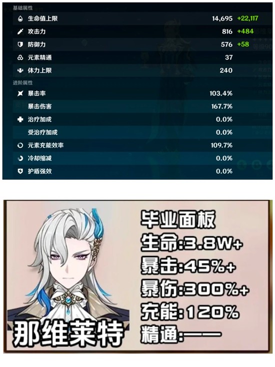 2、畢業屬性需生命值達38W以上,暴擊率超45,暴擊傷害突破300,元素充能效率維持120,元素精通無具體數值要求即可達標。