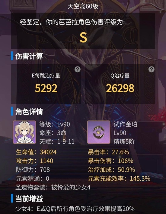 3、圣遺物選定被憐愛的少女四件套,主詞條按生命攻擊生命生命治療加成排序,副詞條著重堆疊生命值屬性。