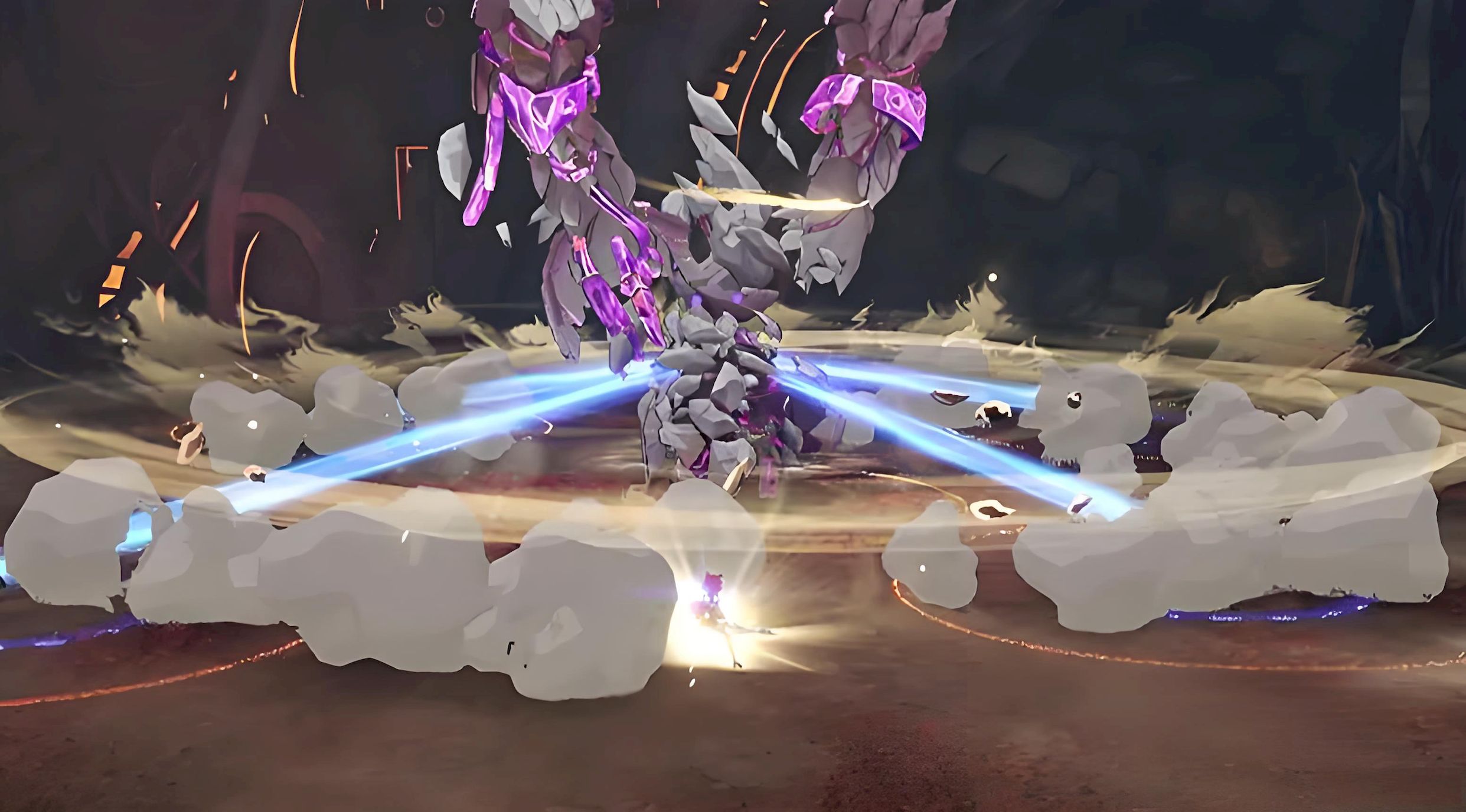 4、最終階段boss生成護盾并蓄力毀滅之巖石,全體玩家跳高臺集火破盾,打斷施法,護盾擊破后boss循環招式,重復流程即可完成通關。