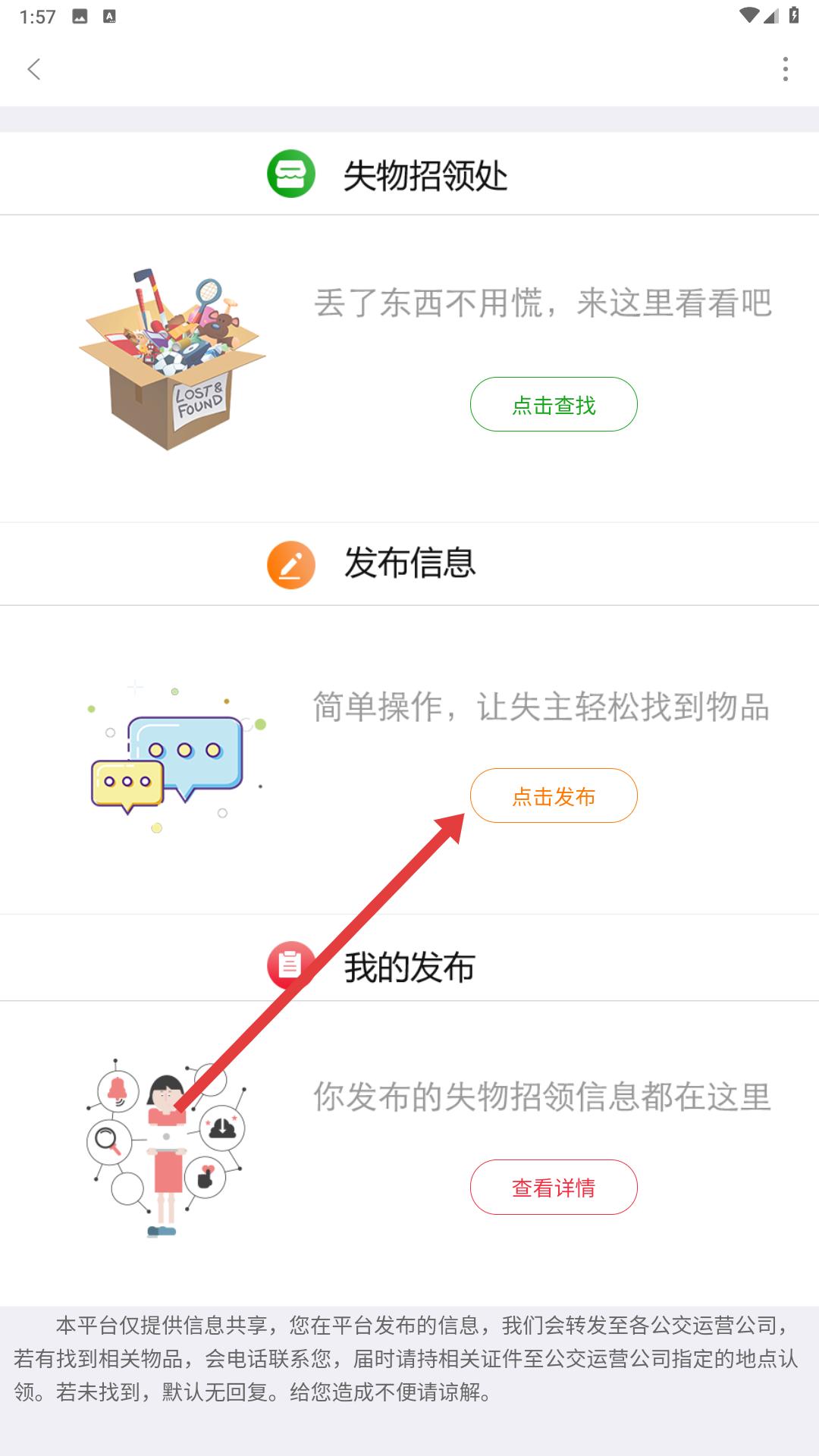 2、進入失物招領處頁面,有查找、發布信息等功能,若要發布失物招領信息,點擊發布信息旁的點擊發布按鈕。