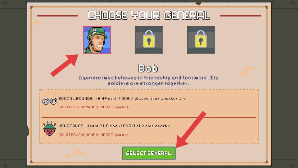 2、在將軍選擇界面,可選擇如Bob等將軍,了解其技能和特點后,點擊SELECT GENERAL,確定所選將軍。
