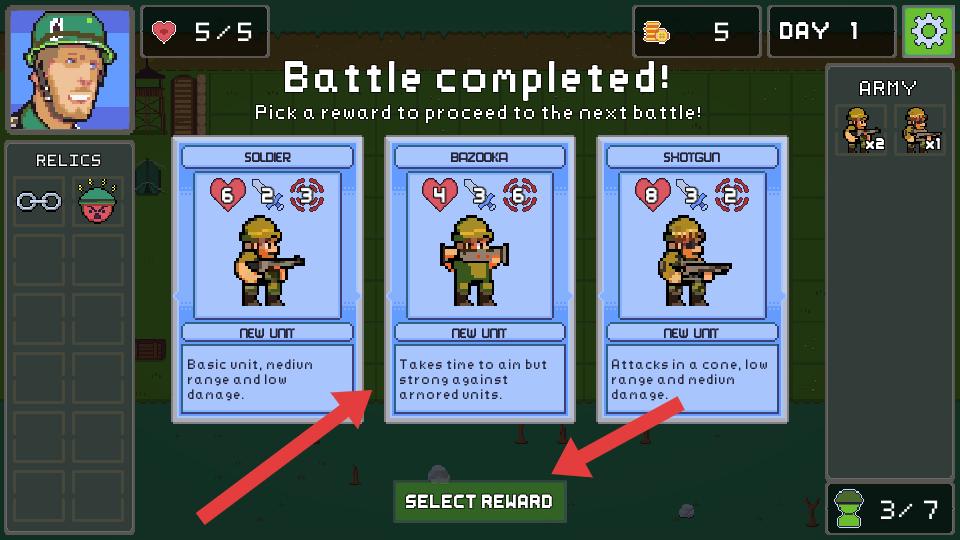 4、戰斗完成后,可從士兵,火箭筒,霰彈槍等獎勵中選擇,點擊SELECT REWARD,領取獎勵后繼續下一場戰斗。