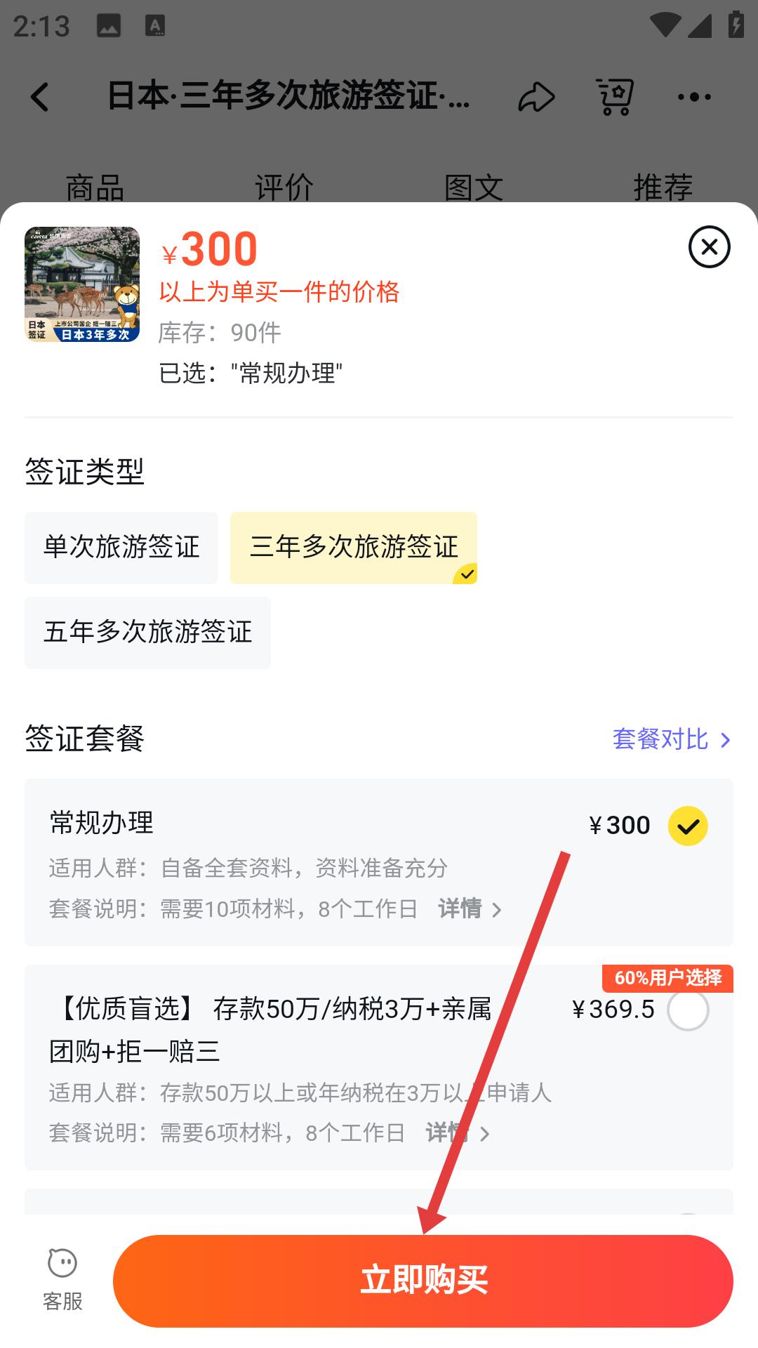 4、在簽證類型及套餐選擇界面,選擇合適的簽證類型和套餐,確認所選內容無誤后,點擊立即購買按鈕,進行后續的支付等購買流程。
