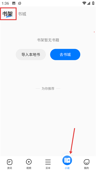 3、小說頁面,書架可管理已添加書籍,也能導入本地書,點擊“去書城”可進入書籍資源庫,選擇感興趣的小說閱讀。