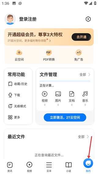 4、我的頁面,可進行登錄注冊,管理文件、使用云空間等功能,開通會員還能享受免廣告、大空間等專屬特權。