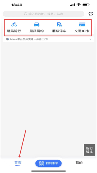 2、登錄后進入首頁,可使用蘑菇騎行網約等功能,通過頂部搜索欄查找目的地線路等,借助底部導航欄切換不同功能頁面。
