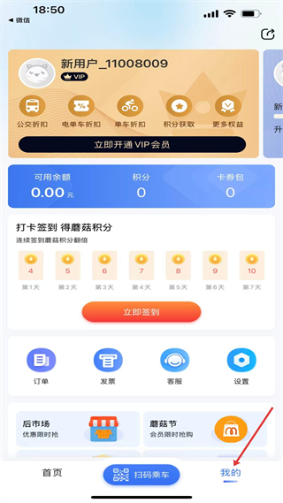 4、進入我的頁面,可查看賬戶余額等信息,參與打卡簽到獲取積分,使用訂單發票等功能,還能開通VIP會員享受相關權益。