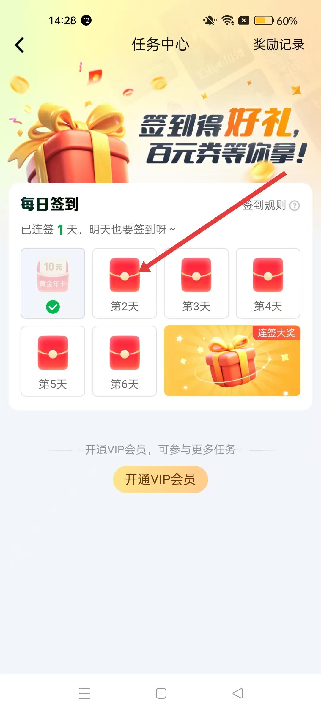 3、然后任務中心每日簽到板塊,可看到連簽天數對應的獎勵,點擊第2天的紅包圖標。