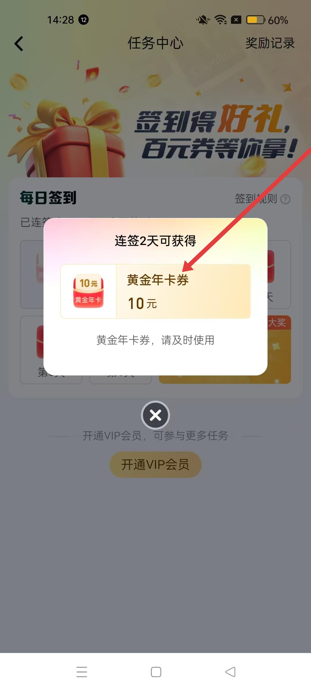4、點擊后會彈出連簽2天可獲得的獎勵提示,能得到10元黃金年卡券,及時使用可享優惠。