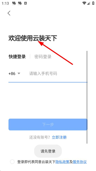 3、進行登錄時,輸入手機號碼,選擇快捷登錄或密碼登錄,勾選同意隱私政策及服務協議后點擊下一步。