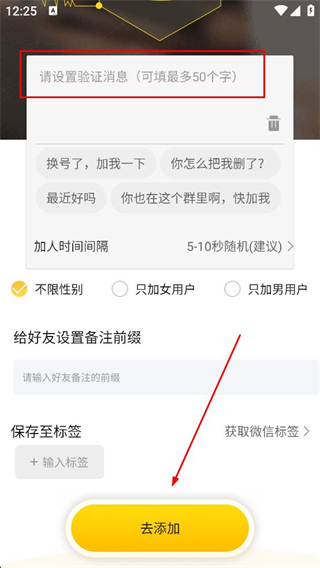 2、在添加頁面設置驗證消息、加人時間間隔等參數,選擇對應的性別條件后,點擊去添加按鈕,開始添加好友。
