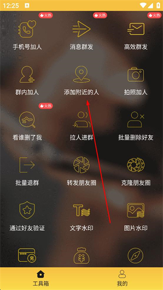 1、進入微友人脈app,瀏覽各類功能選項,選擇添加附近的人功能,進入對應的操作界面。