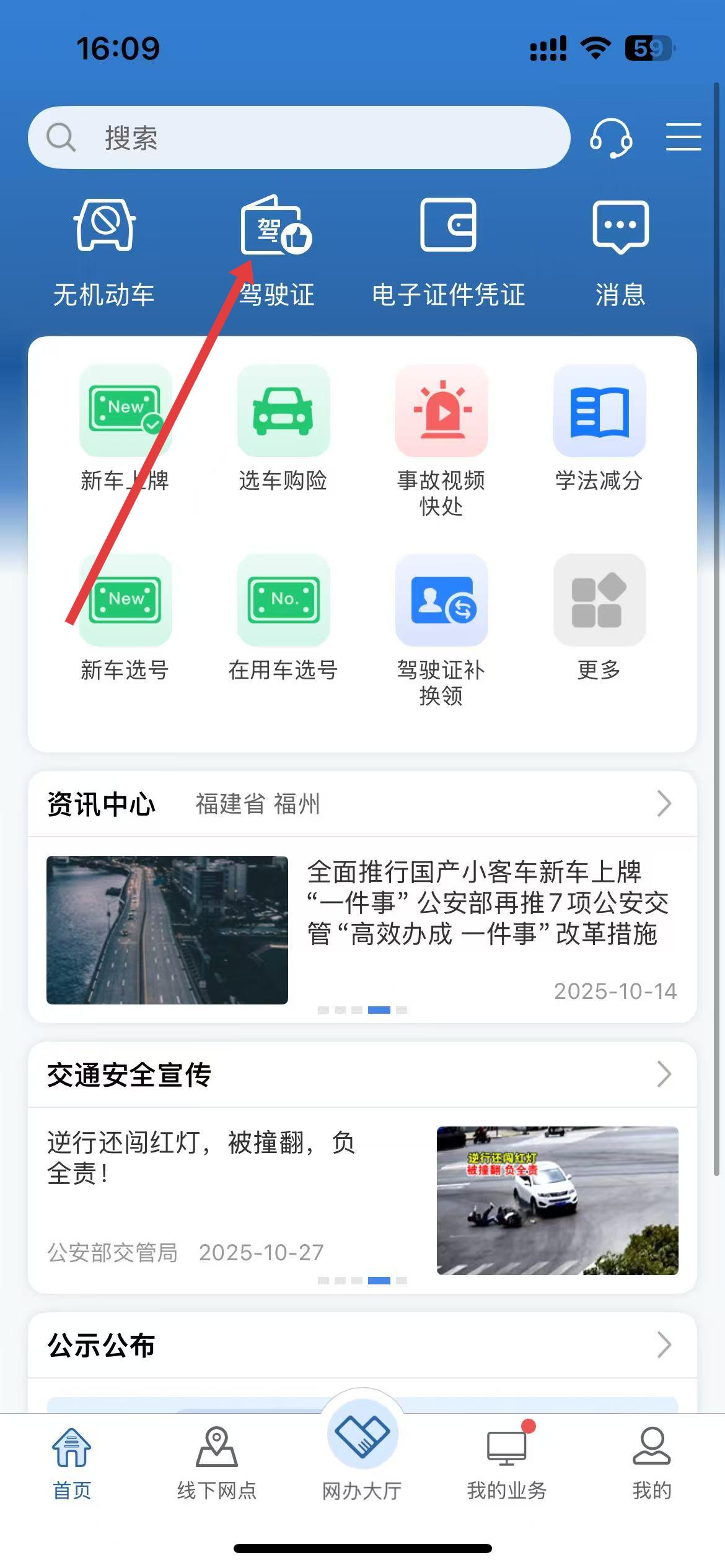 1、進入界面后點擊駕駛證選項,可開啟駕駛證相關信息查詢流程,開始了解駕駛證的各項詳情。