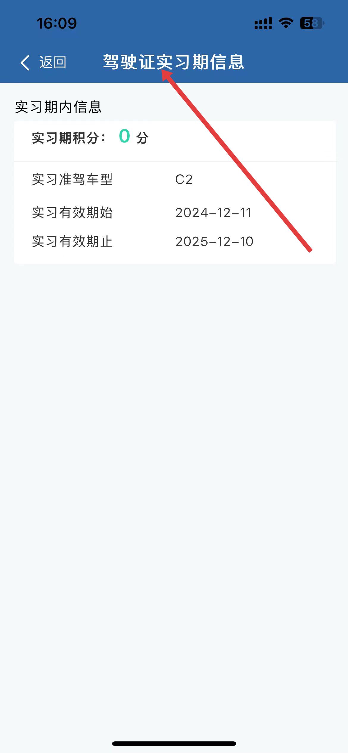 4、進入駕駛證實習期信息頁面,可查看實習期積分、實習準駕車型、實習有效期等信息,掌握實習期動態。