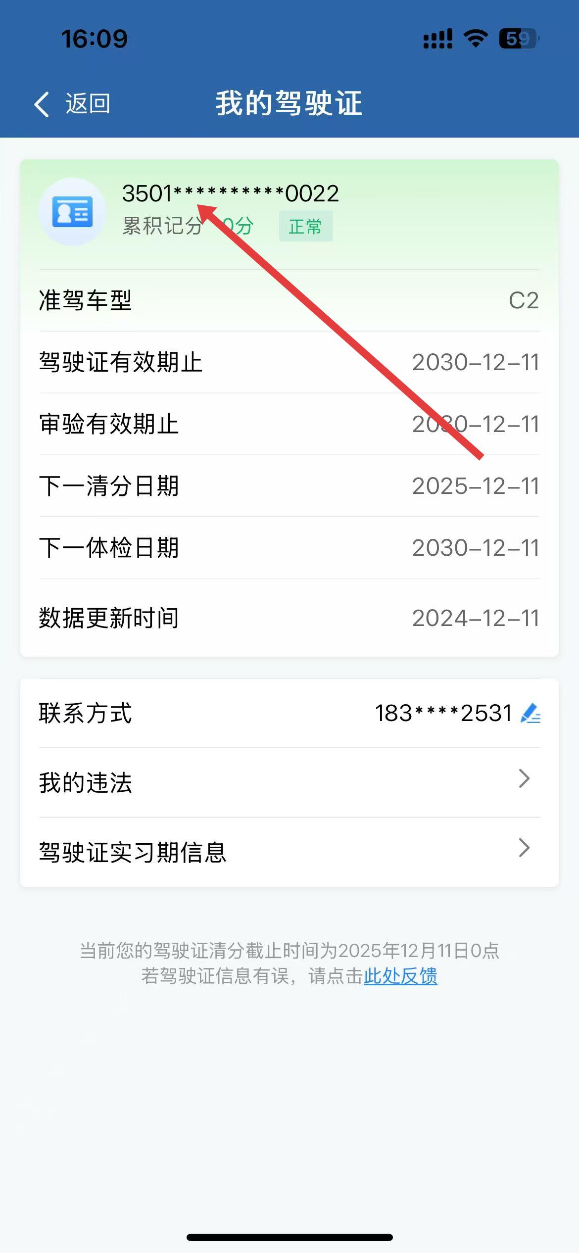 2、進入我的駕駛證頁面,可查看駕駛證的準駕車型、有效期、累積記分等詳細信息,及時掌握駕駛證狀態。