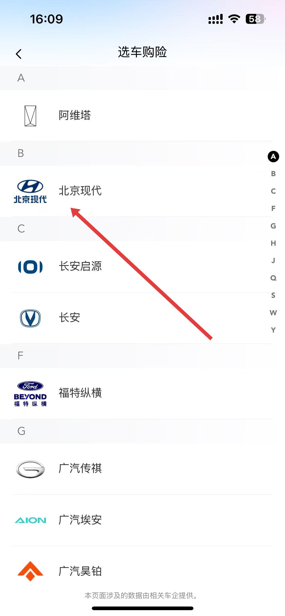 2、選車購險頁面可選擇汽車品牌,如北京現代等,為選車提供品牌選擇方向。