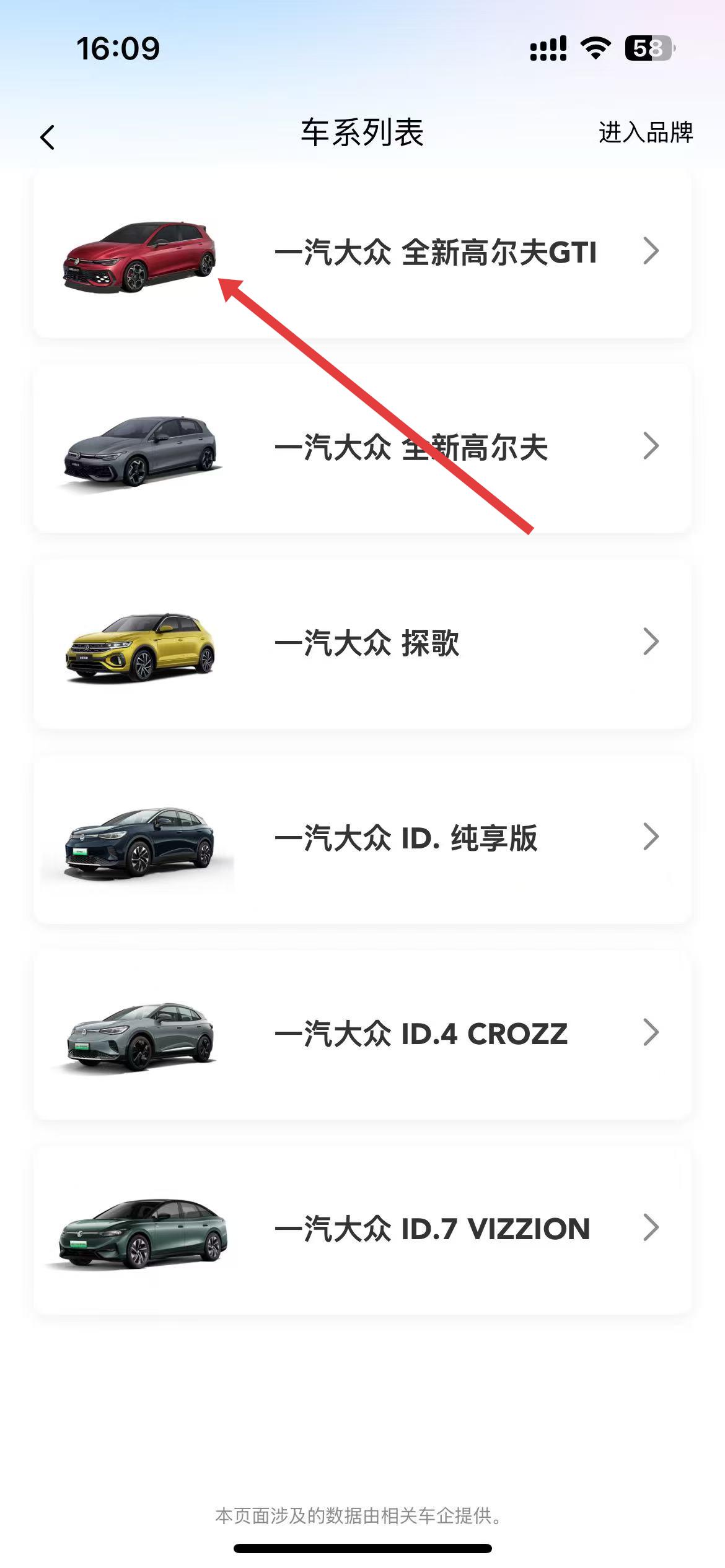 4、還可查看其他品牌的車系列表,如一汽大眾的全新高爾夫GTI等,多品牌多車型對比,助力選到合適車輛。