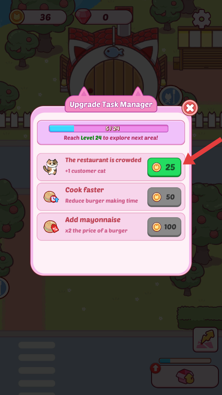 4、還可升級任務管理器,比如花費25金幣增加顧客數量,提升經營效率,朝著達到24級、探索下一個區域的目標邁進。